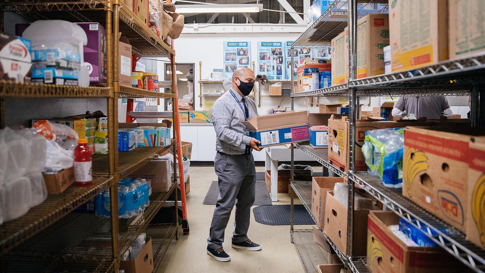 Nancy Dao, clinical pharmacy manager and Fernando Gallegos in the food pantry at Share Our Selves. (Photo by Donnie Lloyd Hedden Jr. for Direct Relief)
