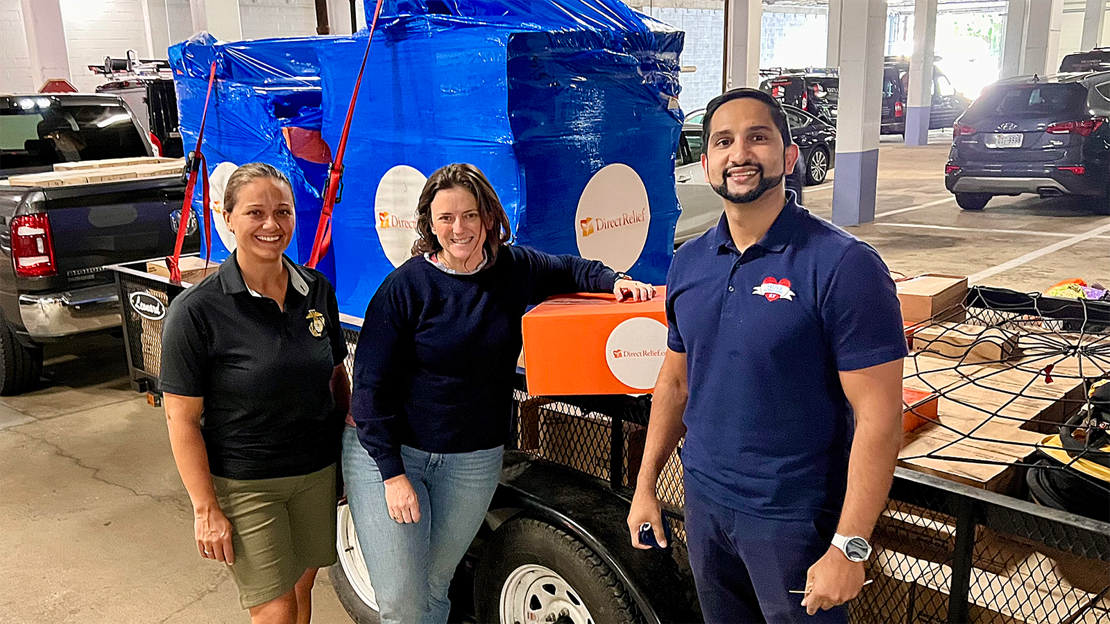 (L to R) Lt. Col. Natalie Trogus, Whitney Bowman-Zatzkin, and Donney John stand with donated supplies for Afghan refugees at the NOVA ScriptsCentral parking lot on Sep. 30, 2021. (Photo Courtesy of Jake Zatzkin)