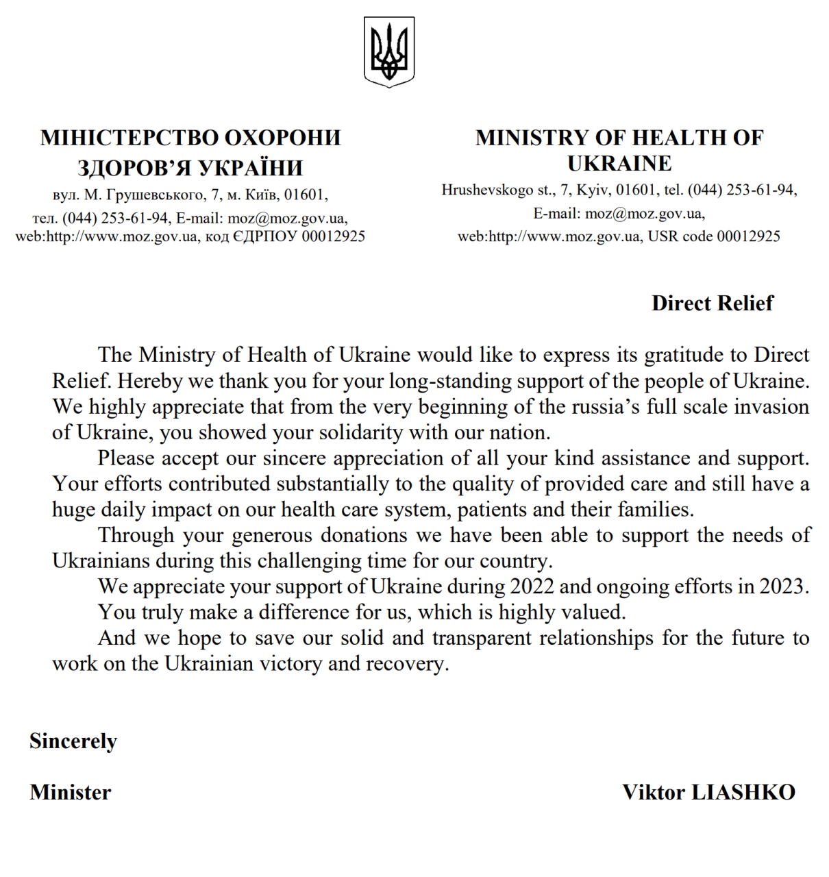 Letter from The Ukrainian Ministry of Health