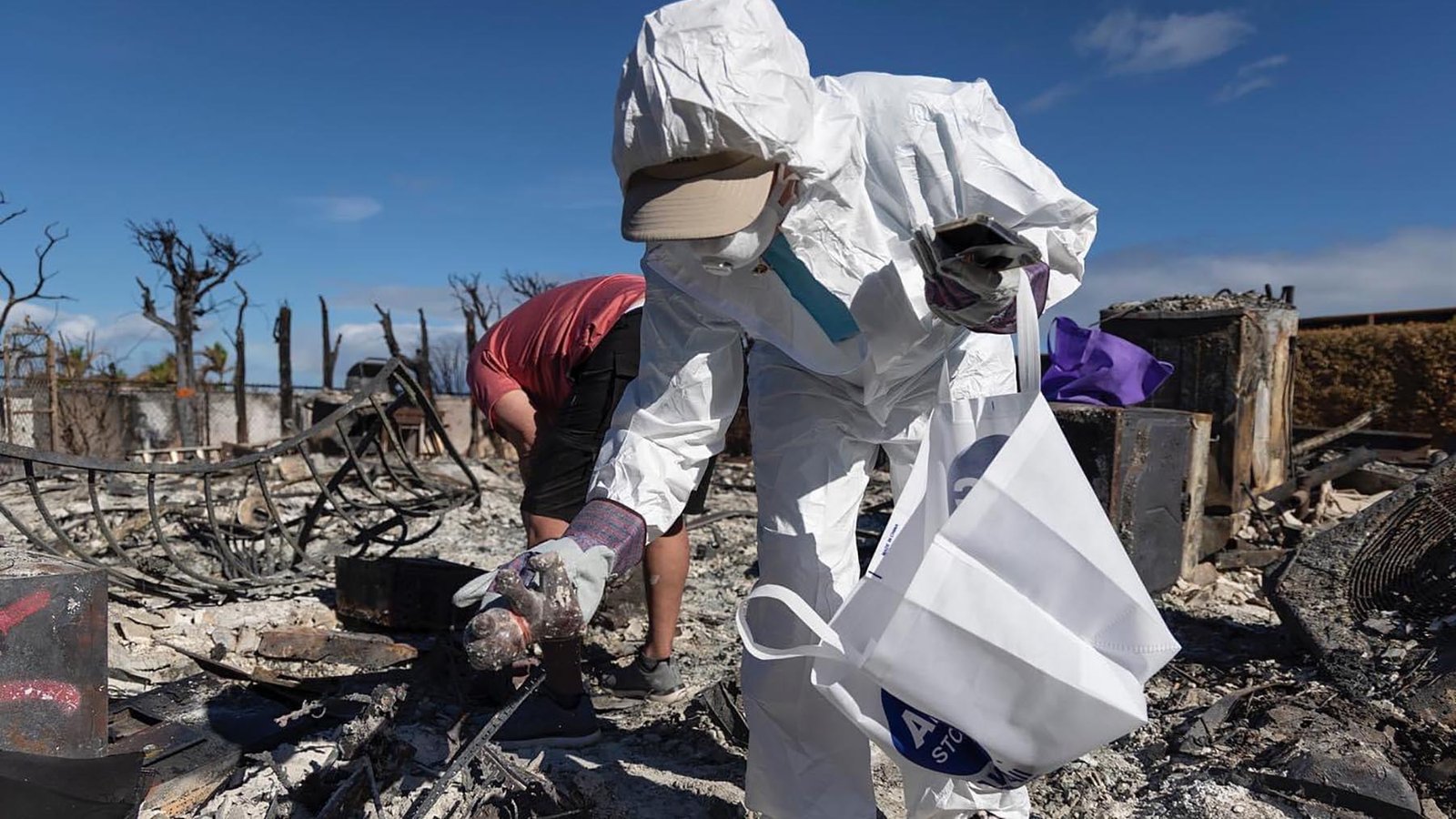 Residents sift through properties in Maui as re-entry occurs in burn zones from last month's devastating fires. Direct Relief-provided protective gear, including body suits, gloves, masks, goggles and more, was distributed to residents to protect them from ash and chemicals resulting from melted plastic, drywall and more. (County of Maui photo)