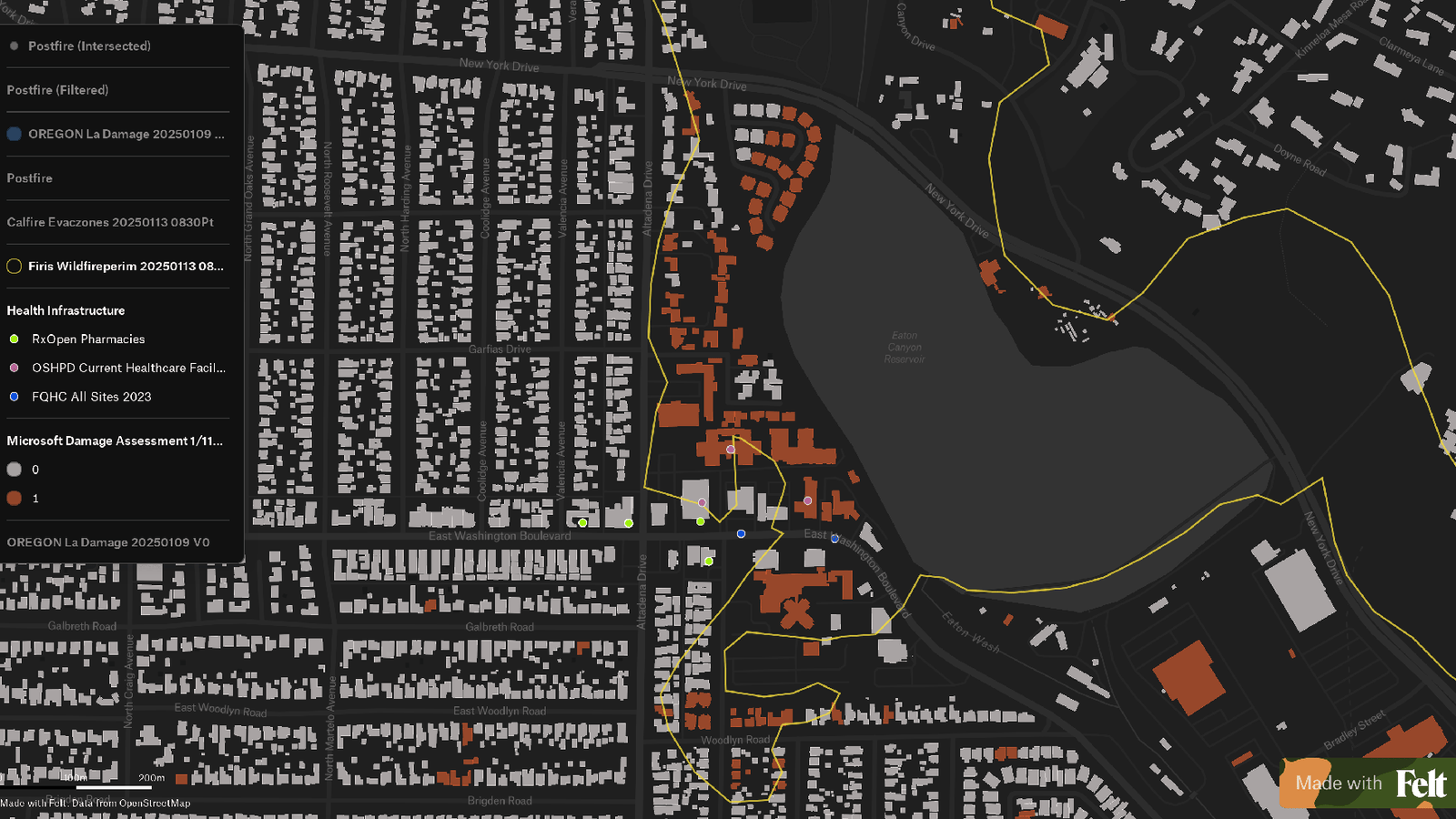 An interactive mapping application displays modeled damage data along with fire perimeter and health facility information from Los Angeles for the Eaton Fire as of January 13. (Direct Relief)