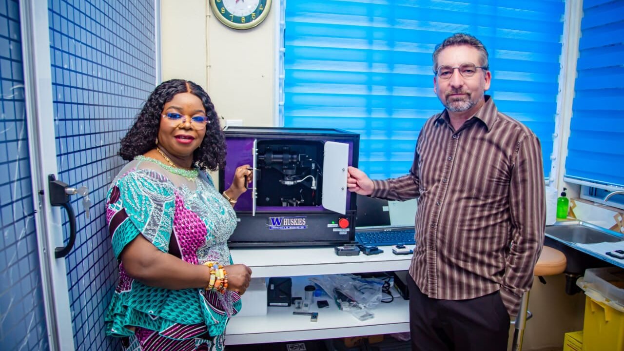Dr. Beatrice Wiafe Addai, CEO of BCI and Peace and Love Hospital, and Mark Edward Fauver, an engineer from the University of Washington, with a CoreView machine. (Photo by David Uttley for Direct Relief)