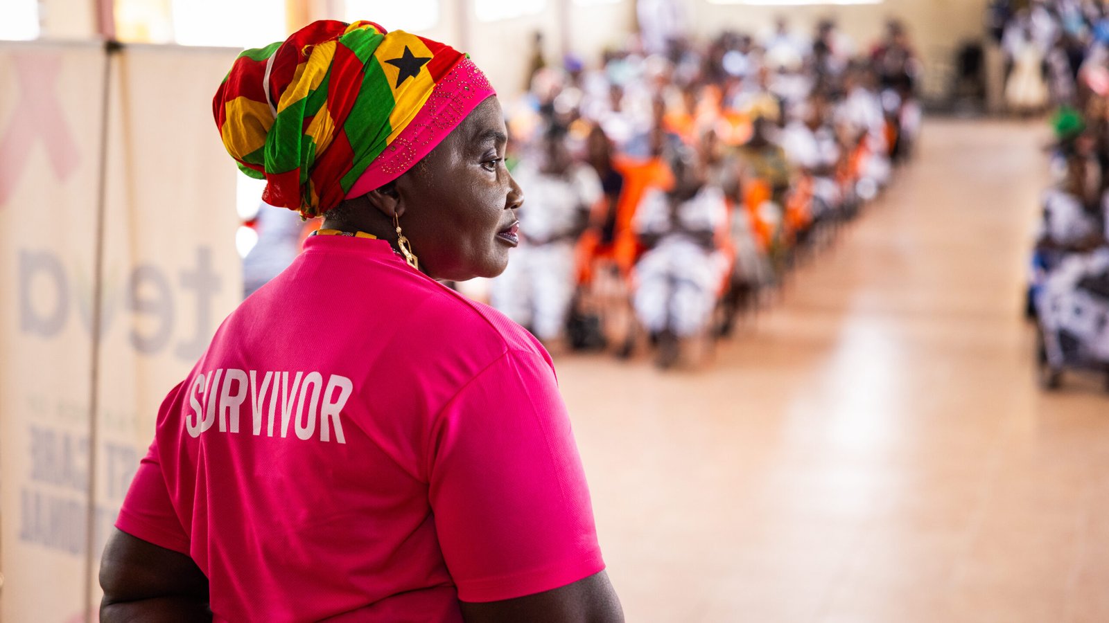 Raheema Quaye, a double mastectomy and 19-year cancer survivor, is a peer navigator employed at Peace and Love Hospital and Breast Care International,. Quaye is pictured at a health education event organized by Dr. Beatrice Wiafe Addai in Ghana during August 2025. (Photo by David Uttley for Direct Relief)