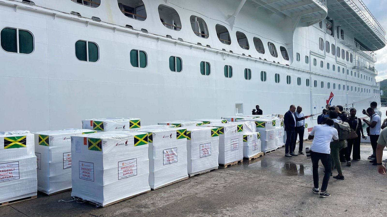 The shipment’s arrival in Ocho Rios was welcomed by Government of Jamaica officials, Ministry of Health and tourism leaders, along with representatives from Carnival and Direct Relief.
