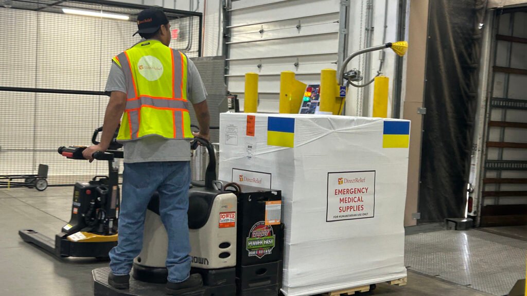 Emergency medical aid departs Direct Relief’s warehouse, including essential medications and clinical supplies to support partners in Ukraine. (Shannon Hickerson/Direct Relief)