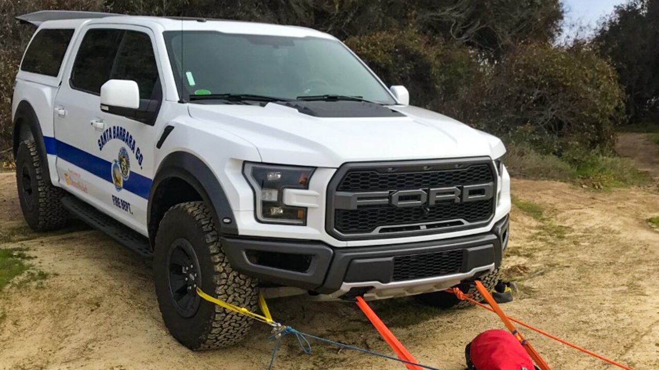 Santa Barbara Fire Department is using their new Ford Raptor and Honda Pioneer UTV in tandem, hitching the utility vehicle to the truck, which was the configuration when they used the vehicles in responding to the Camp Fire in Paradise, California.