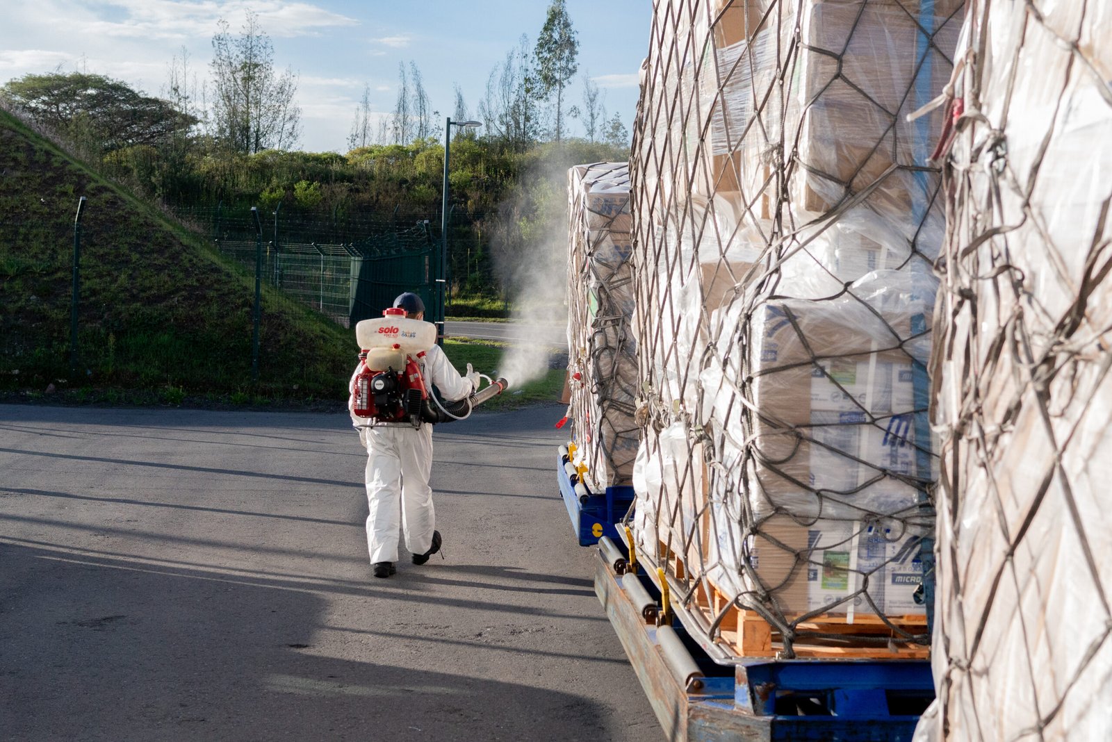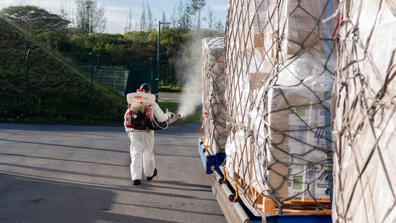 Staff of the Ecuadorian custom facilities disinfecting the donated shipment from Direct Relief, which arrived to the county on June 4, 2020 to mitigate the impact of the Covid-19 emergency in Ecuador. (Isadora Romero for Direct Relief)