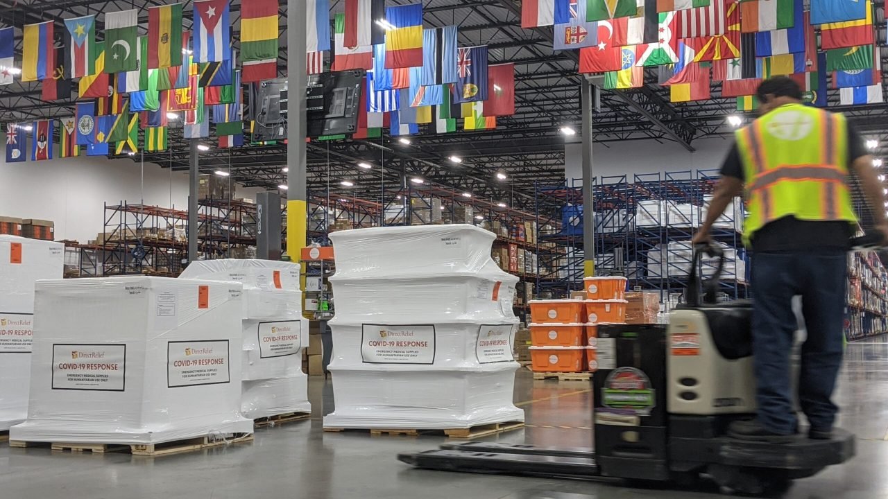 The Direct Relief shipment includes 20 of Direct Relief’s ICU Critical Supply Modules, each with medications and supplies selected to treat up to 500 critically ill Covid-19 patients, along with 150 oxygen concentrators, five ventilators, and large quantities of personal protective equipment.