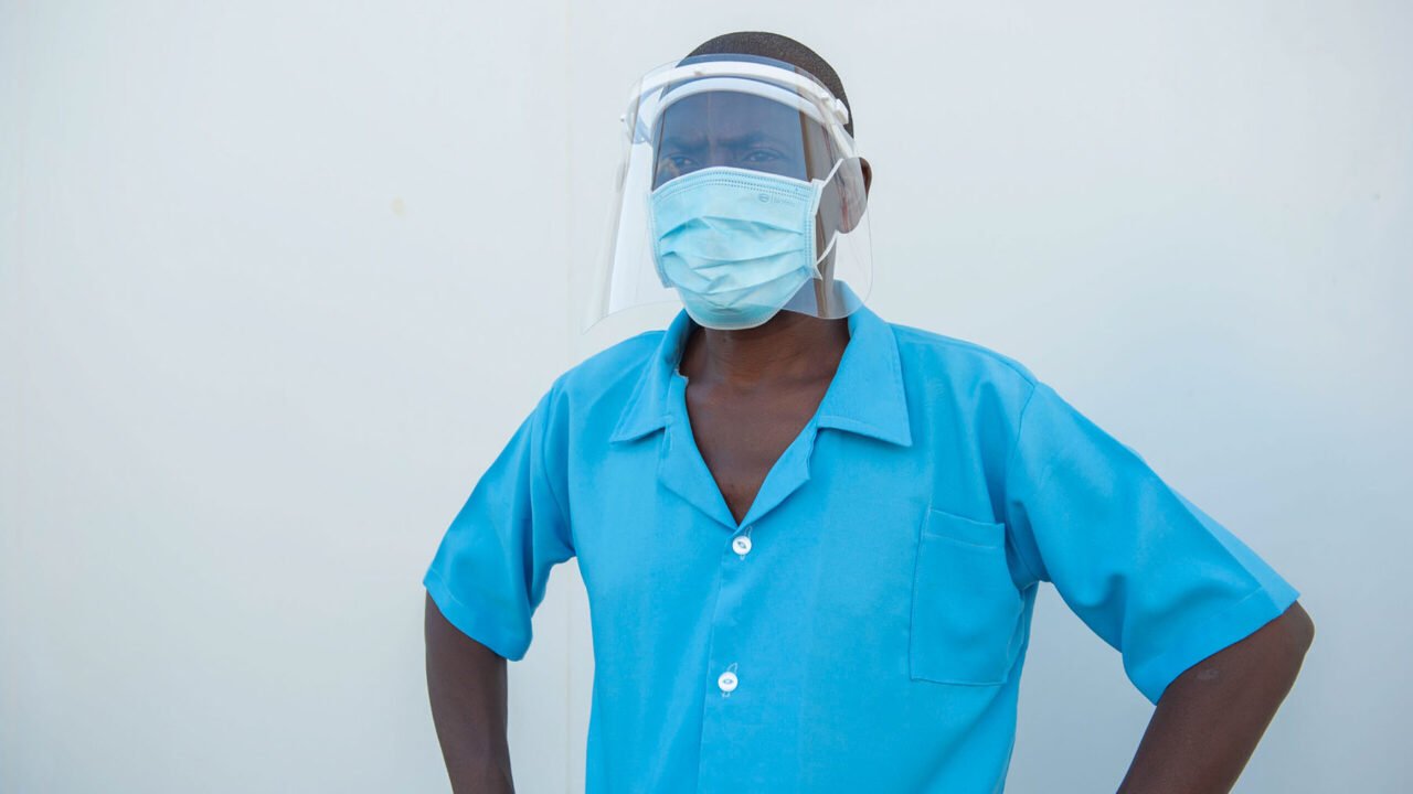 Health worker Reuben Chipelesa of Nkhunga Health Centre in Malawi wears donated PPE from the Covid-19 Action Fund for Africa. (Photo courtesy of Homeline Media)