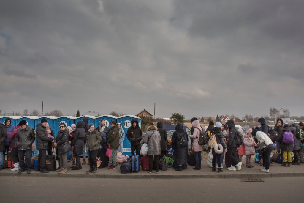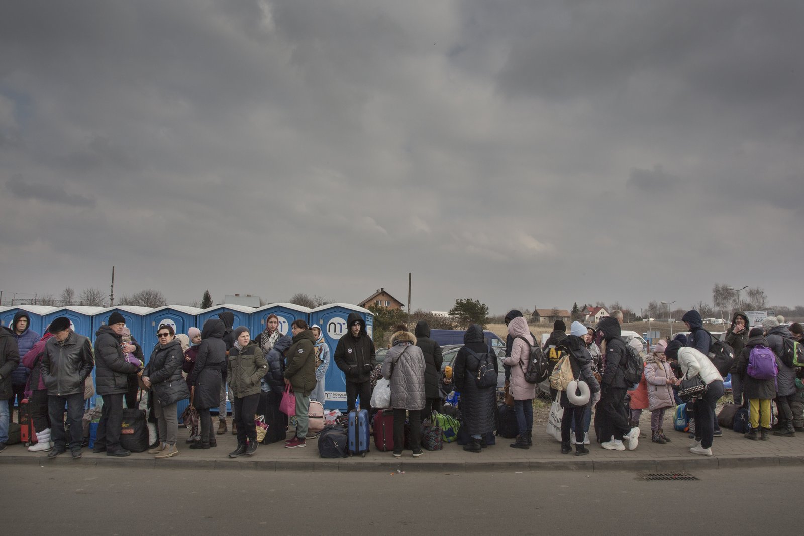 At Medyka, a Polish town near the border with Ukraine, Ukrainian refugees waited in line in March 2022 for a bus to take them to Przemyśl, a town in Poland acting as a main point of reception for Ukrainian refugees. As more Ukrainians return back to the country, health needs are high with medical facilities under strain. (Photo by Oscar Castillo for Direct Relief)