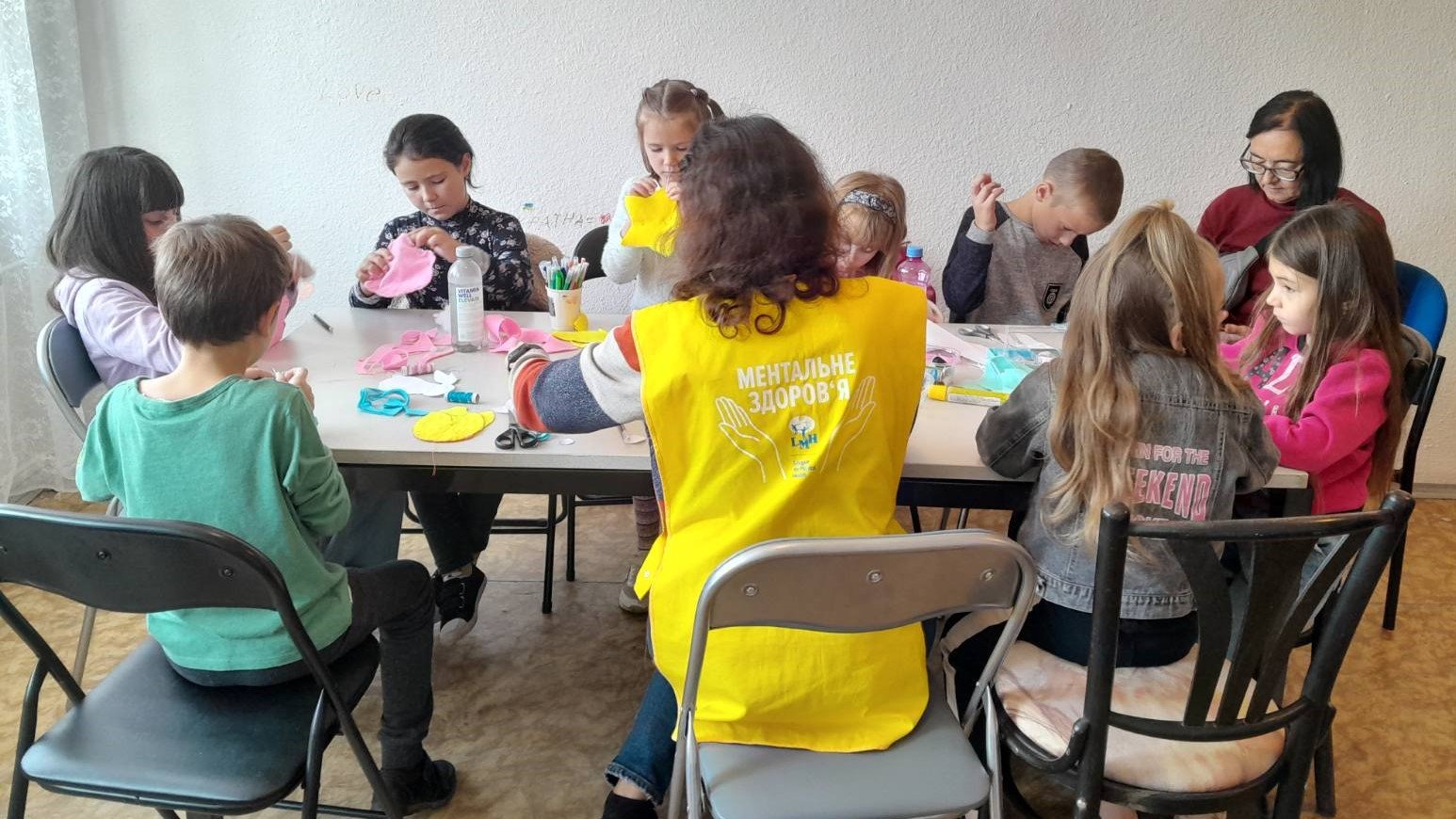League for Mental Health staff facilitates a craft activity for a group of kids at Gabčíkovo Asylum Seeker Accommodation Centre in Slovakia. (Photo Courtesy of The League for Mental Health)