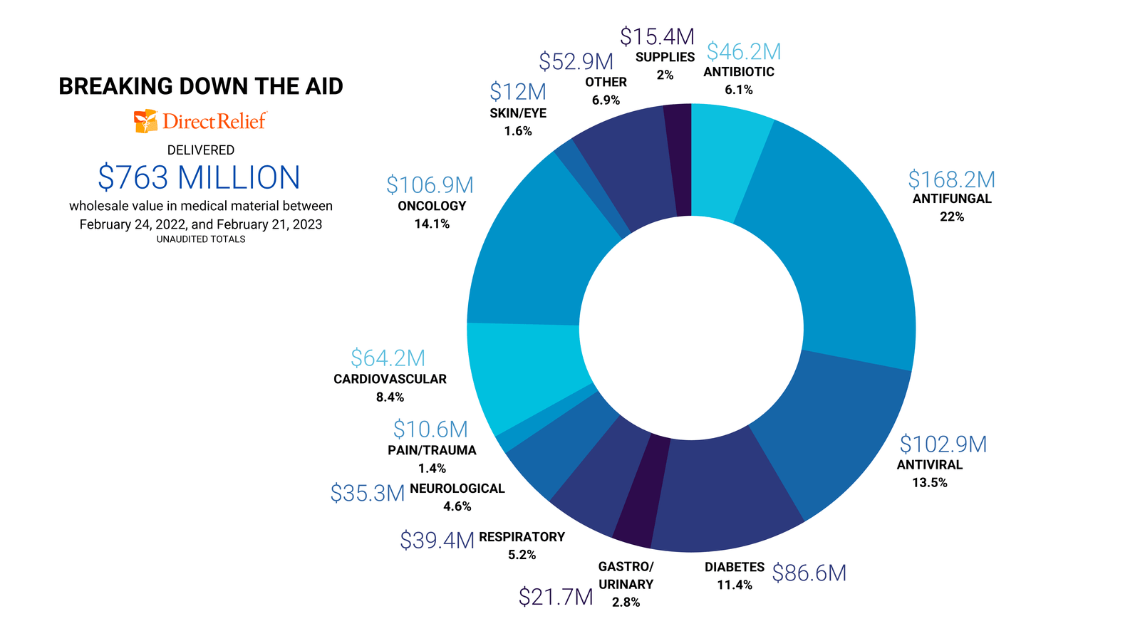 Since February 2022, Direct Relief has donated 8.3 million units (e.g., bottles, vials, pre-filled syringes) of prescription medications. Direct Relief also provided millions of units of non-pharmaceutical products such as pen needles, oxygen concentrators, generators, ambulances, medical consumables, and other health care technology.