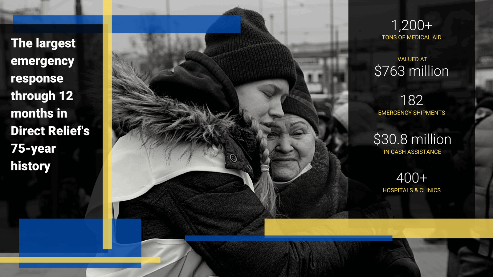 Direct Relief responded immediately and has continued an extensive, high-tempo, high-volume operation over the past 12 months. The organization’s assistance to Ukraine detailed in this report has been the largest response in its 75-year history – all with private resources, made possible by the extraordinary participation of individuals, organizations, and businesses globally.
