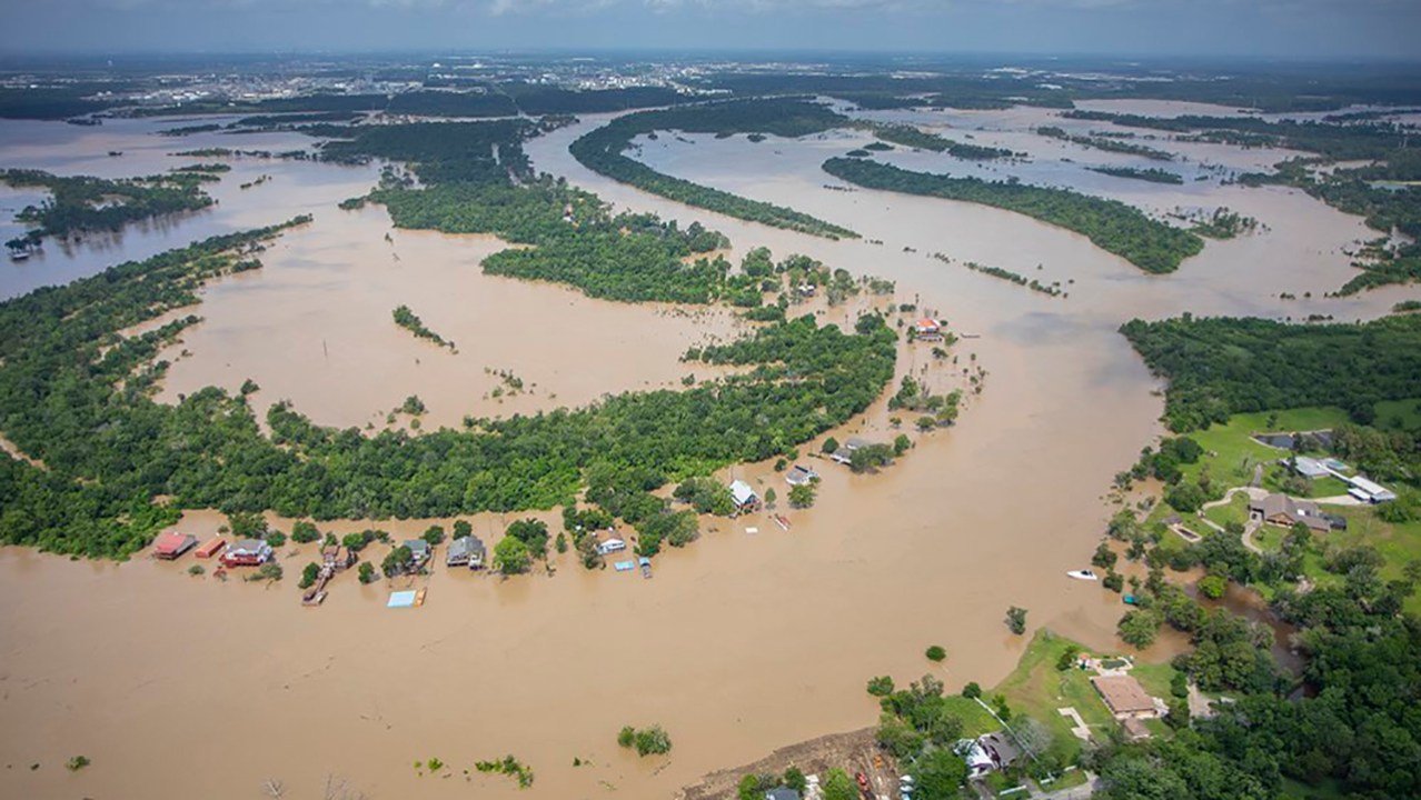 Swollen riverbanks as seen from the air in Harris County, Texas, on May 3, 2024. Heavy rains inundated many areas in East Texas last weekend, requiring hundreds of water rescues and displacing thousands. (Photo courtesy of Harris County Judge Lina Hidalgo's Office)
