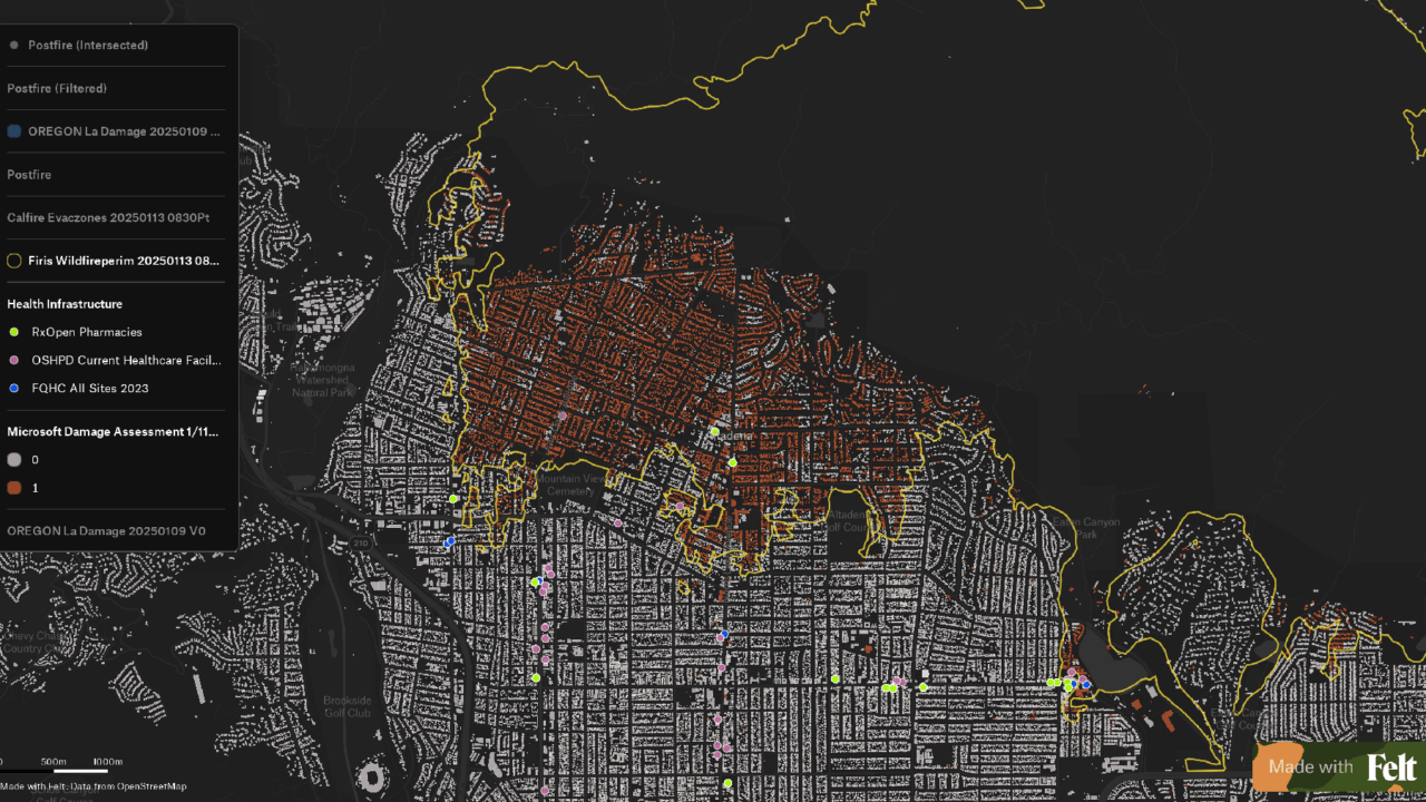 That understanding was critical for evaluating risks to healthcare infrastructure. By integrating remote-sensing damage assessments with health facility databases—from California’s OSHPD to the federal Bureau of Primary Health Care—Direct Relief identified several clinics and care centers within the Eaton Fire zone that were either destroyed or likely damaged.