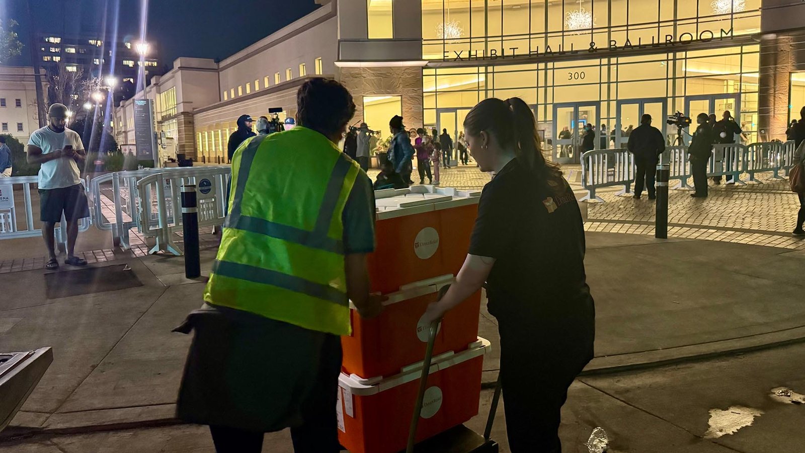 Direct Relief Pharmacy Specialist Pacience Edwards delivers essential medications, including diabetes medications, respiratory therapies, and other requested medications to the Pasadena Convention Center on the evening of Jan. 9, 2025. The convention center was hosting hundreds of evacuees, including many older adults and medically vulnerable people. (Direct Relief photo)